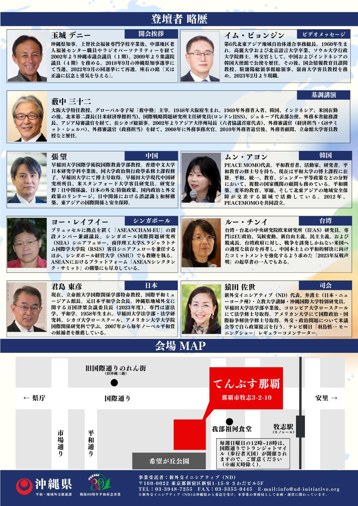 今回、大阪大学特任教授であり外務省で外務事務次官などを歴任された藪中三十二氏による基調講演や、中国・韓国・シンガポール・台湾の識者によるパネルディスカッションを実施し、緊張緩和に向けた方策や、沖縄の地域外交が果たす役割について考えます。