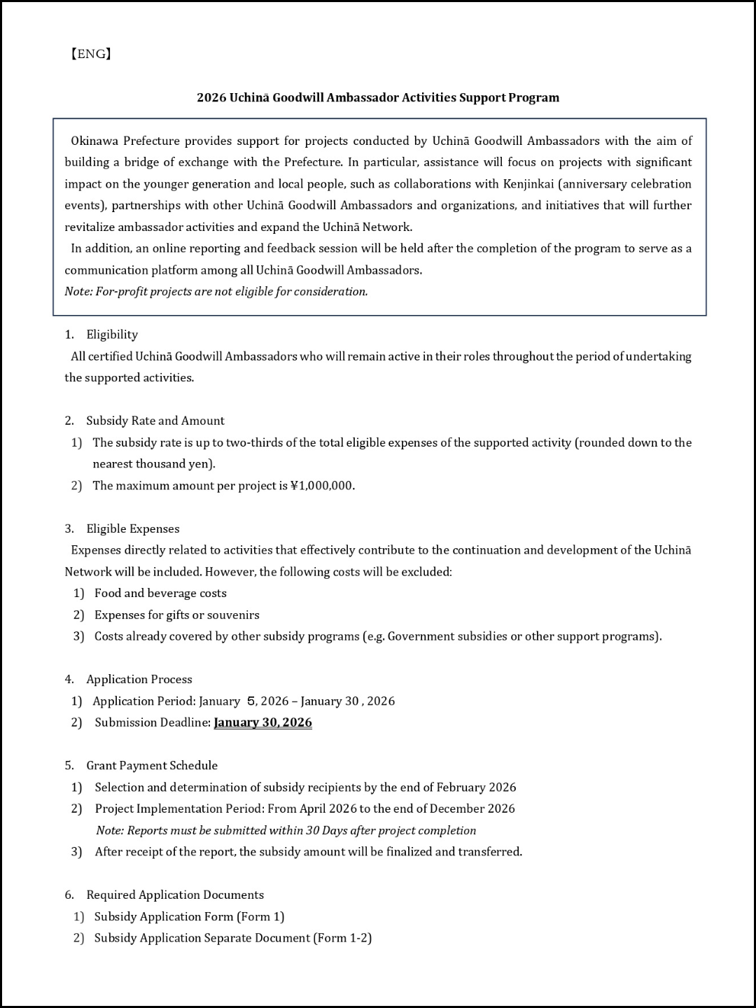 2026 Uchinā Goodwill Ambassador Activities Support Program